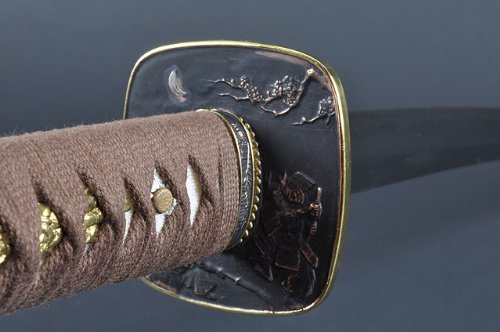 Tsuka(handle): Wood covered in genuine same (rayskin) & then wrapped in the traditional diamond pattern with Japanese cotton Ito & with golden Menuki;