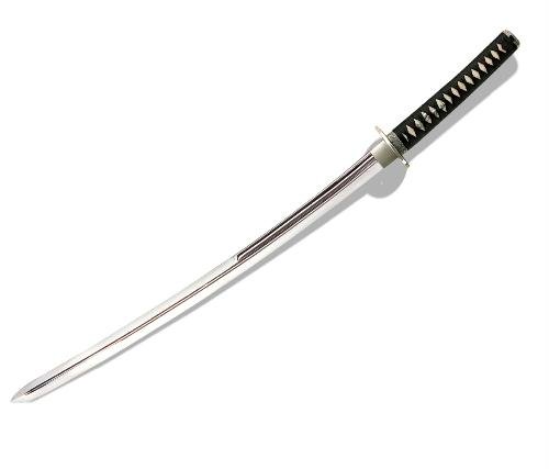 Japanese Swords : Our factory has used only traditional materials for our Japanese sword’s fittings. The Tsuba (guard), Fuchi (collar), and Kashira (pommel), are expertly made and finely crafted in nickel-silver brass.The Habaki (blade collar) is hand made out of nickel-silver brass and each hilt is covered in Samé (ray skin) and tightly wrapped in the traditional style with black silk cord. A beautiful Menuki (a small ornamental sculpture inserted between the ray skin and the cord wrappings on the handle) enhances the sword’s aesthetic appearance and makes for a sword that is as traditional looking as we can possibly make it. All feature fully sharpened 1055 carbon steel blades, each heat treated to a spring temper. The blade surface is then given a careful polish by hand, with a distinctive mirror polish applied to the fuller (blood groove).All come complete with a Black Lacquered Scabbard and a Blue-Violet Cover Bag.Double Edge Katana Specifications:Weight : 37.2 oz.Thick : 9/32"Blade : 28 3/4"Handle : 10 1/2" long.Samé (Ray Skin) black silk braid cordSteel : 1055 CarbonOverall : 39 1/4" Black Lacquered Wood Scabbard